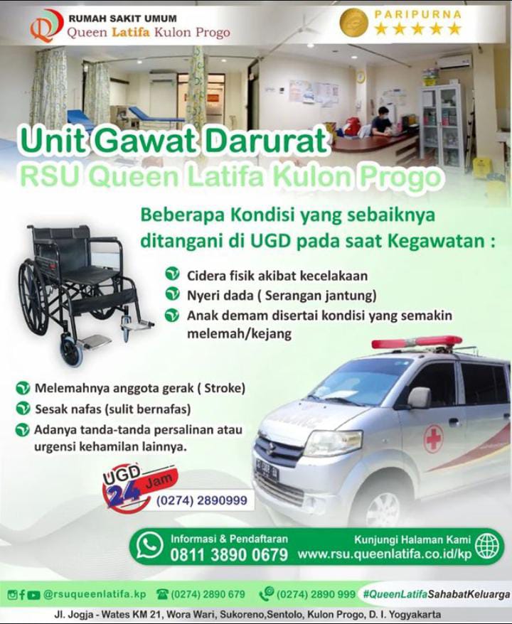 Halo Sahabat, Informasi seputar Unit Gawat Darurat ya sahabat,beberapa kondisi yang sebaiknya ditangani di UGD RSU Queen Latifa Kulon Progo Yuk cek postingan berikut ini. Jangan ragu untuk selalu mempercayakan layanan kesehatan di RSU Queen Latifa Kulon Progo —————————————— Informasi lebih lanjut tentang layanan RSU Queen Latifa Kulon Progo lainnya dapat menghubungi :