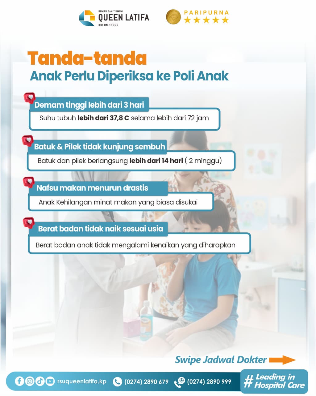 Anak-anak membutuhkan perawatan khusus dan perhatian yang tepat untuk menjaga kesehatan mereka. Poli anak di RSU Queen Latifa Kulon Progo siap membantu Anda dengan tenaga medis profesional dan fasilitas modern.