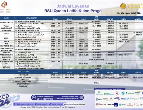 Hallo Sahabat…Ada informasi terupdate nih..Jadwal Layanan RSU Queen Latifa Kulon Progo ya sahabat.Yuk cek lengkapnya melalui postingan diatasJangan ragu untuk selalu mempercayakan layanan kesehatan di RSU Queen Latifa Kulon Progo——————————————————–Informasi lebih lanjut tentang layanan RSU Queen Latifa Kulon Progo lainnya dapat menghubungi :☎️ ( 0274 ) 2890 679???? 0811 3890 0679✉️ rsuqueenlatifakp@gmail.com