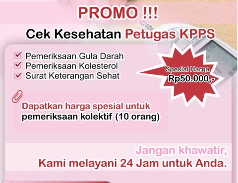 Hallo Sahabat…Ada promo untuk cek kesehatan petugas KPPS ya..-Pemeriksaan gula darah-Pemeriksaan kolesterol-Surat keterangan sehatDapatkan harga spesial untuk pemeriksaan kolektif (10 orang)Yuk cek lengkapnya melalui postingan diatasJangan ragu untuk selalu mempercayakan layanan kesehatan di RSU Queen Latifa Kulon Progo——————————————————–Informasi lebih lanjut tentang layanan RSU Queen Latifa Kulon Progo lainnya dapat menghubungi :☎️ ( 0274 ) 2890…